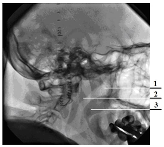 Static image of a frame of high-speed dynamic radiography of the nasopharynx in a sagittal projection (1—airway of the nasopharynx, 2—posterior pharyngeal wall, 3—soft palate).
