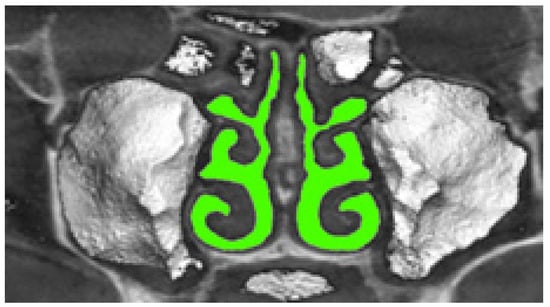 The method by which it is possible to study the configuration of the structures of the nasal cavity quite comprehensively is X-ray computed tomography [,,,,,,,,,,]. The method allows for visualizing both bone structures and soft tissues and to segment the airways [,,] by digital tomographic image processing [,,,,]. In addition, CFD models, which are based on computed tomography data, allow to study the aerodynamic characteristics of the upper respiratory tract [,,,,,,,,,,,]. The works in which the correlation of the results between the data of computed tomography, rhinomanometry and acoustic rhinometry are studied are quite relevant [,,,].