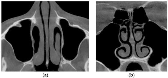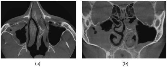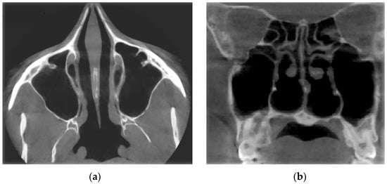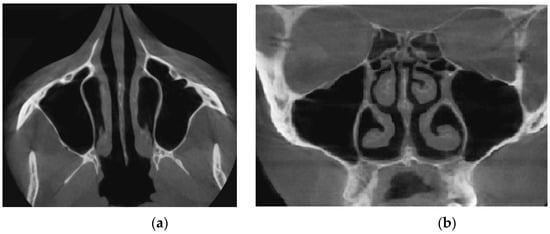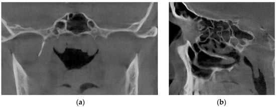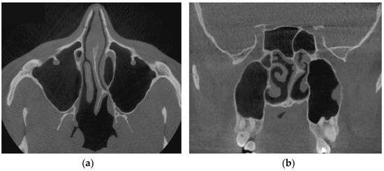 - Pirner, S.; Tingelhoff, K.; Wagner, I.; Westphal, R.; Rilk, M.; Wahl, F.M.; Bootz, F.; Eichhorn, K.W. CT-based manual segmentation and evaluation of paranasal sinuses. Eur. Arch. Oto-Rhino-Laryngol. 2009, 266, 507–518. [Google Scholar] [CrossRef]