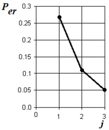 A graph of the decrease in the error in making a diagnostic decision when comparing a violation of nasal breathing with a conditional norm when adding data from various diagnostic methods: optical endoscopy, computed tomography, rhinomanometry (j = 3 is the dimension of the space of informative parameters).