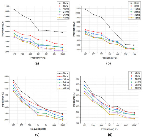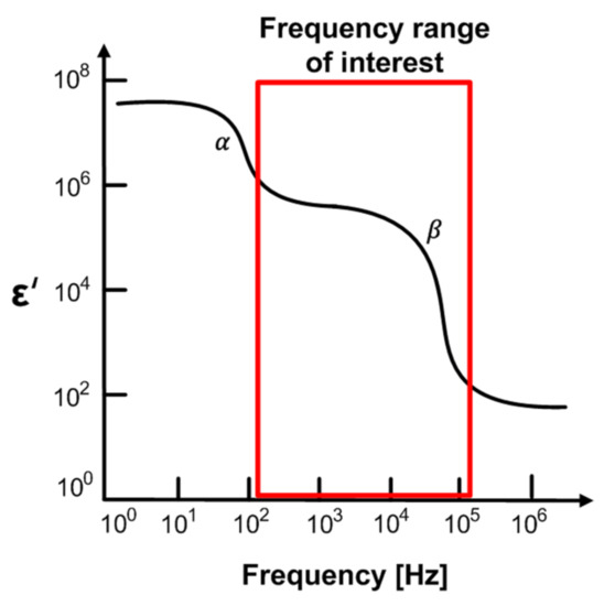 Figure 3 shows dispersions of the biological system [34]. The α-dispersion is caused by polarization in the range of Hz to kHz, and β-dispersion in the range of kHz to MHz is mainly due to the Maxwell–Wagner effect, which is related to the interface polarization occurring in the system between two materials with different currents. In general, the α-dispersion and β-dispersion are more relevant to the cells states and are commonly used in impedance measurements for biological tissue studies. Especially, β-dispersion is related to the genetic properties of the cell membrane and the interaction between the cell membrane and the extracellular or intracellular electrolytes. This is directly associated with cell membranes’ behavior. It can be used in meat aging studies based on membrane integrity, because the oxidation of the phospholipid membrane layers and lysis occurring during aging makes the membrane porous and reduces the membrane’s insulating properties. As the meat ages, the impedance magnitude gradually tends to decrease, since the cell membranes are permeable. Therefore, we measure the freshness of meat through impedance measurements from 100 Hz to 1 MHz to discriminate the b-dispersion region.