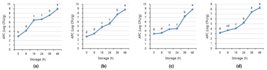 The APC level of (a) beef loin (quality grade 1+), (b) beef loin (quality grade 1), (c) beef round (quality grade 1+), and (d) beef round (quality grade 1) over the storage periods at room temperature (23 °C). a–e Different superscript letters above bars indicate a significant difference at p < 0.05.