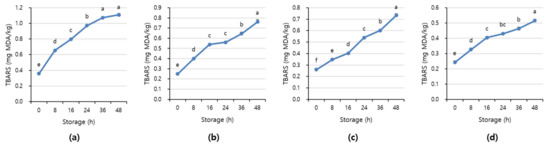 The TBARS value, which indicates the degree of rancidity of meat maintenance, is a measure of the intensity of the red color produced by the reaction of malondialdehyde (MDA) and thiobarbituric acid (TBA) generated by the oxidation of fat [43]. The range of TBARS in which the rancid off-odor that occurs in beef can be sensed varies from 0.6 to 2.0 mg MDA/kg [44]. The maximum allowable rancid off-odor in beef was 2 mg MDA/kg, and a value of more than 1.2 mg MDA/kg means it is completely spoiled [45,46].