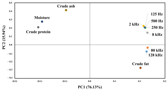 Figure 9 shows the results of principal component analysis for the composition of beef and impedance spectroscopy. The impedance value for each frequency and the value of the first principal component for the general component are 76.13%. The value of the second principal component is 15.94%, which means that the first principal component can explain 76.13% of the data. All impedance values and crude fat content are distributed on the right side of the first main component, so that the higher the crude fat, the higher the impedance value. The second main component indicates the difference by frequency, and frequencies below 8 K show a high correlation with crude protein and moisture. In contrast, the 128 and 80 K frequencies show a high correlation with crude fat.