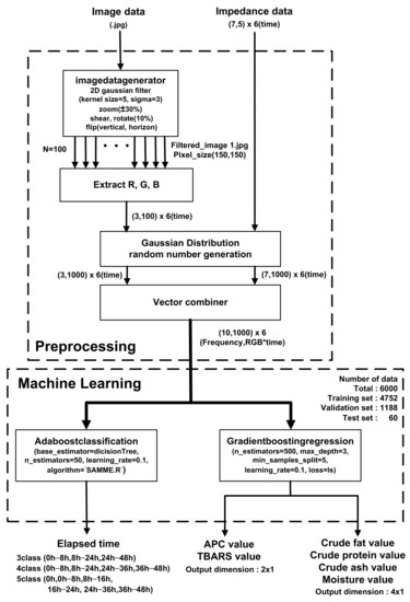 Figure 10 shows a block diagram of the prediction algorithm. In pre-processing, filtered images are generated for each storage period (0, 8, 16, 24, 36, and 48 h) for a sufficient amount of training data. After applying a 2D Gaussian filter with kernel size = 5 and sigma = 3, ±30% zoom, 10% shear, 10% rotation, vertical flip, and horizontal flip are applied, and 100 images with a size of (150,150) pixels are used to extract the R, G, and B of each pixel with (3100*6) vectors. Then, using Gaussian distribution random number generation and a vector combiner, the averaged R, G, and B values of the images and EIS were combined to generate (10,1000) vectors over the storage periods. The 79.2%, 19.8%, and 1% of the generated data set were used for training, validation, and testing, respectively. Prediction was performed with an AdaBoost (adaptive boosting) classifier and gradient boosting regressor based on a decision tree learner. In the boosting method, a gradient boosting method is performed in which the error of the previous tree is determined through a negative gradient while creating trees sequentially and an Adaboost method is performed in which the classifier adaptively changes the wrong part and places a high weight on the classifier with many misclassified data and reflects it in the next sample classification [52]. The classifier estimates the storage periods of meat at room temperature based on combined vectors from EIS and meat images. The estimation accuracy was evaluated according to the number of classes (3, 4, and 5) that can distinguish between the complete corruption of APC and the pretense of TBARS. The parameters max_depth = 1, n_estimator = 50, learning_rate = 0.65, and Algorithm = SAMME.R were used for fast converges with low errors with fewer boosting iterations. When predicting a storage period with three classes (fresh (0–8 h)/rancid (8–24 h)/spoiled (24–48 h), the use of EIS significantly improves accuracy by up to 85%. In contrast, the accuracy is 56.7% when only images are used in the classifier, as shown in Table 4.