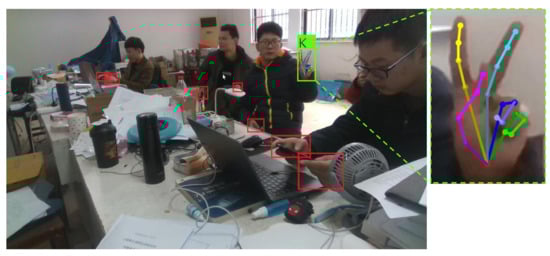 The proposed approach detects hands, recognizes the foreground hand gesture, and estimates the hand pose simultaneously. The red boxes denote the detected background hands, the green box denotes the detected foreground hand which is performing a gesture, the label attached to green box denotes the recognized gesture, and the right figure zoom in on the corresponding hand pose estimation result.