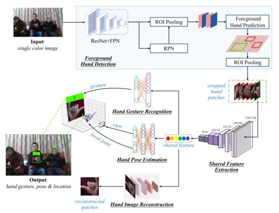 The proposed approach aims at hand gesture recognition from single color images in complex unconstrained environment. It takes a single color image as input, detects the foreground hand, recognizes the gesture of the foreground hand, and estimates the 3D hand pose simultaneously. The output of the approach is the 2D location (bounding box), gesture category, and 3D pose of the detected foreground hand. As can be seen in Figure 2, the proposed approach contains 5 modules: (1) foreground hand detection, (2) shared feature extraction, (3) hand gesture recognition, (4) hand pose estimation, and (5) hand image reconstruction. The network can be trained by a semi-supervised learning scheme when the hand pose annotation or the hand gesture annotation is unavailable. Details of the approach will be addressed as follows.