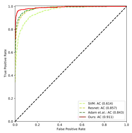 The ROC curves of the compared methods are shown in Figure 3. The true positive rate is correlated with the false positive rate. The target is to achieve high true positive rate with low false positive rate. In other words, the closer the ROC curve be to the top-left corner, the better the ROC performance is. As can be seen in the figure, the ROC performance of Ours is better than that of the compared methods. The gesture recognition confusion matrix of Ours is shown in Figure 4. The x-axis denotes the predicted gesture category of the sample, and the y-axis denotes the ground-truth of the sample. The higher probability on the diagonal of the confusion matrix is, the more accurate the gesture recognition is. As it can be seen, most of the gesture categories can be accurately classified, while some gestures are more difficult to be recognized than the others. In the ASL alphabet, some static hand gestures are very similar to other gestures, for example, “K”, “V”, “M”, “N”, “S”, “T”. It is hard to distinguish these “difficult” gestures when the distance from the hand to the camera is not near or the lightening condition is not well. For example, the gesture “M” may be falsely classified as “N” by a rate of 0.15.