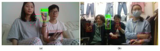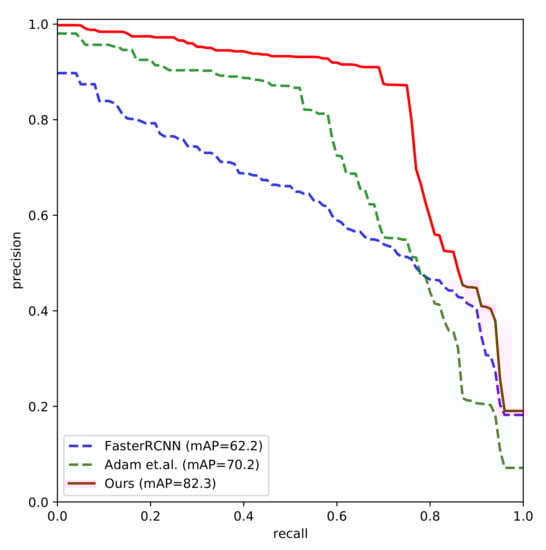 where N denotes the number of classes, i denotes the class index, and denotes the AP of class i. In this study, , that is, 24 ASL hand gestures and background hand. The following methods are compared: (1) FasterRCNN [51], one of the most widely used object detection baselines in the computer vision community; (2) Adam et al. [4]; (3) Ours, the proposed approach.