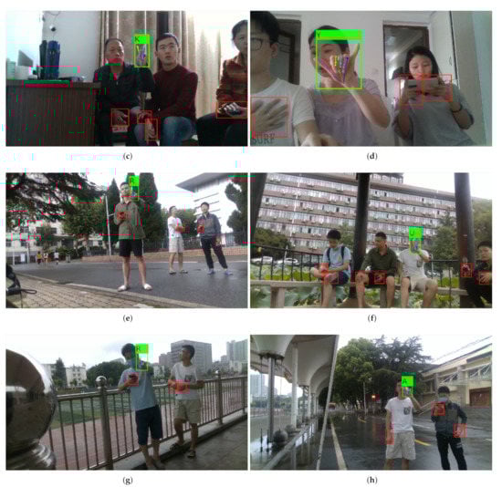 In complex unconstrained environments, there may exist multiple hands. We detect all hand instances with different gesture categories in unconstrained environments. The gesture detection accuracy is evaluated using the mAP metric defined in the object detection field [51]. Firstly, we calculate the Average Precision (AP) of each class with an IOU threshold of 0.5, and then the mean AP of all classes is defined as