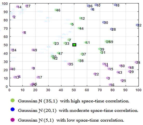 In order to generate the signal of interest, we suppose that is the space domain, where x and y are the space coordinates. Consider that we have H different regions, where is the space domain of region , and . Likewise, we suppose that the time is slotted into equal time slots . Without a loss of generality, in Algorithm 1 we describe how to generate a correlated portion of the signal representing one region, where is the time domain and is a point in plane that corresponds to region h. The signal of the whole area is the combination of all the generated portions.