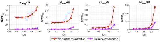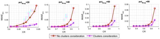 when compared to the algorithm of comparison, especially in the high compression ratios, i.e., when the number of transmitting sensor nodes is very limited. Note that without enforcing the involvement of all the clusters in the data sensing and transmission process, sensor nodes that belong to the small clusters could be totally ignored, which gravely deteriorates the recovery process.