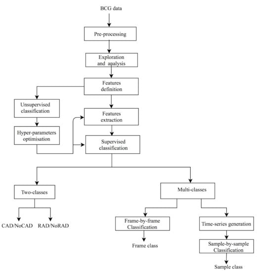 We adopted a progressive approach, the flowchart of which is presented in Figure 1. The first step, after the BCG signal pre-processing, of content-based BCG signal exploration and understanding includes the temporal and spectral analysis of the BCG signal during different human body activities (for example, resting, coughing and movement). The analysis permits us to consider the use of two spectral features, namely the Spectral Flatness Measure (SFM) and Spectral Centroid (SC). These are defined according to a frame-by-frame analysis, which means that the BCG signal can be decomposed into pre-defined time duration slices. After features behavior analysis, a clustering task, which is the core of many segmentation methods, is carried out in order to determine the usefulness of selected features for classifying the BCG signal into many classes. The number of classes and the hyper-parameters related to the frame size are optimized thanks to the Gaussian Mixture Model (GMM). Next, in order to establish the link between the number of classes and the nature of human body activity, a supervised classification is proposed. Two types are defined: the first one is a two-class approach that aims to classify a selected frame into one permitting the measurement of HR (binary flag cardiac activity detection (CAD)/NoCAD as an output) and another one permitting the measurement of RR (respiratory activity detection (RAD)/NoRAD). We recall that this kind of binary output is useful to drive HR and RR detectors. In fact, during coughing, there is no need to try to measure the RR, for example, since information on respiratory activity is absent and not relevant. The second supervised classification is a refined one since it gives information about the type of human body activity (resting, coughing, expiration, movement, etc.). We deal with coarse and fine approaches. The coarse approach makes use of features calculated for each frame while the fine approach considers a sample-by-sample classification. To this end, frame-by-frame features are converted to time-series thanks to a novel idea presented in this paper. The segmentation consists of identifying the bounding of each human body activity.