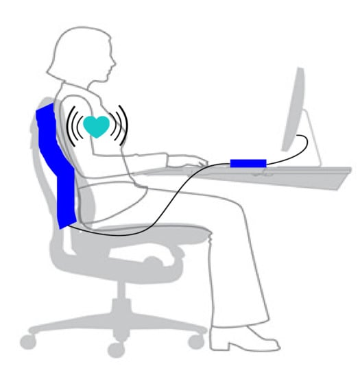 The system used for collecting data included a small FOS mattress and a module to gather optical data from the mattress. This particular process and more details about the feasibility, conception and performance of the FOS micro-bend sensors are available in the literature (for example, [11] or [15]). The FOS mattress was fixed on the back of a regular office chair, as shown in Figure 2. The system used for collecting data included a small FOS mattress and a module to gather optical data. The raw data were sampled at 50 Hz by the module. During the whole experiment, the subject wore a Hexoskin and was asked to sit still on the chair for a duration of 5 min. During this time, a Raspberry Pi 3B recorded the data streamed on the serial port of the FOS’s module.
