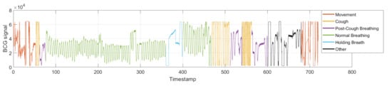 Figure 3 illustrates an example of the BCG signal acquired when following the experimental protocol. The different human body activities are plotted in different colors. The objective of this is to highlight the differences in the BCG signal according to the activity; for example, during normal respiration, the signal periodicity is observable, and so it is thought that we can easily measure the cardiac and respiratory vital signs using classic approaches. During the coughing exercise, it was difficult to detect the periodicity that originated from the respiration rhythm and the cardiac rhythm. In fact, the recording of the BCG shows that the signals attained the maximum value allowed by the acquisition equipment. This can also be noted during the movement phase. The peaks displayed in these different activities were not a result of the physiological activity of the body but of the physical activity. Moreover, in addition to the classes defined in the experimental protocol, a post-cough class has been added. Indeed, careful observation of this step showed particular variations in the BCG signal which did not appear with the other classes. Finally, another class called “others” includes other behaviors not foreseen in the experience.