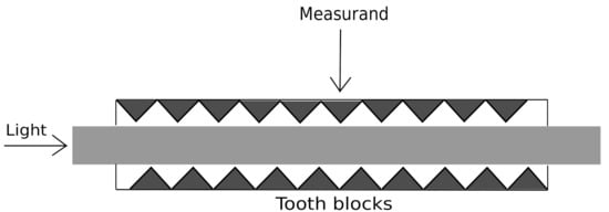 Microbend FOS principle. The light passing through the microbend FOS is modulated by the deformations in the optical fiber due to the displacement of the micro-benders [23].