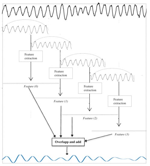 - First, the original BCG signal was decomposed into frames of length 1024 with an overlap of 960 samples (an increase of 64 from frame to frame). The Hamming window was used for this. An example of the original BCG signal, the moving Hamming window and the generated frames are illustrated in the top part of Figure 6.