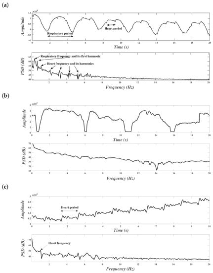 Illustration of temporal evolution and frequency representation of BCG signals. (a) normal respiration in still position, (b) during coughing activity, (c) while holding breath.