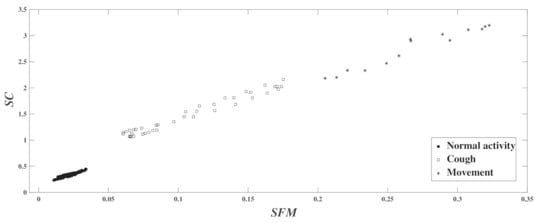 To illustrate, in a preliminary stage, the effectiveness of SFM and SC to discriminate between different kinds of activities that appear in the BCG signal, the following steps were followed. The signal was decomposed into frames of 20 s duration. This choice was justified as follows: the respiratory cycle is longer than the cardiac cycle, and techniques to measure the longest rate—i.e., the respiratory rate—require the existence of at least three respiratory cycles in the frame. Knowing that the lowest respiratory rate (highest period) is 10 respiration cycles per minute, three cycles were obtained during . We chose a duration of 20 s, giving 1000 samples for a sampling frequency of . It is important to note that this duration seemed to be long enough that boundary epochs (i.e., the time intervals for a transition between one body activity and another occurring) are handled. Unfortunately, these epochs are considered in the spectral features for frame-by-frame analysis, but thanks to the sample-by-sample analysis carried at the end of this study, this limitation was alleviated.