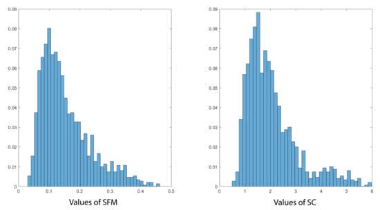 We used the two features of the Spectral Flatness Measure (SFM) and Spectral Centroid (SC). They are computed as follows. First of all, the discrete-time BCG signal, denoted as , is decomposed into frames of short duration. These frames should be long enough to carry information about the activity but not overly long to avoid an overlap of two or more different activities. In the frequency domain, the short-term Fourier transform is calculated and its amplitude is extracted. Its module is denoted as , where m is the frame index and k is the discrete frequency.