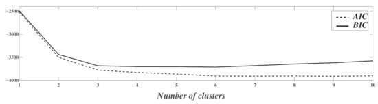 Classically, and regardless of the classification problem, many criteria are defined to formally determine the number of Gaussian components; for example, the Akaike Information Criterion () [29] and Bayesian Information Criterion () [30]. They are defined as follows: