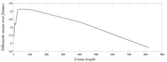 GMM modeling requires the optimization of the frame size. The used criterion is the silhouette, which provides information about the goodness of fit of a certain model [31]. It takes into consideration the between-cluster distance as well as the within-cluster distances, which makes it particularly interesting for an unsupervised learning context. The expression of the silhouette is the following: