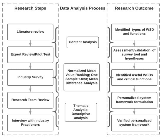 The fourth step in the research process involves the formulation and assessment of a framework for a personalized WSD system. In this step, the research team, which comprises five researchers with extensive experience in construction safety and technology use research (12 years of experience, on average), assessed the result from the survey and formulated a framework for a personalized WSD system that will have better odds of diffusion across the industry. This step will help ensure that multiple academic perspectives are provided for the framework. Insights from the academics will be synthesized and consensus will be gained before moving to the next step.