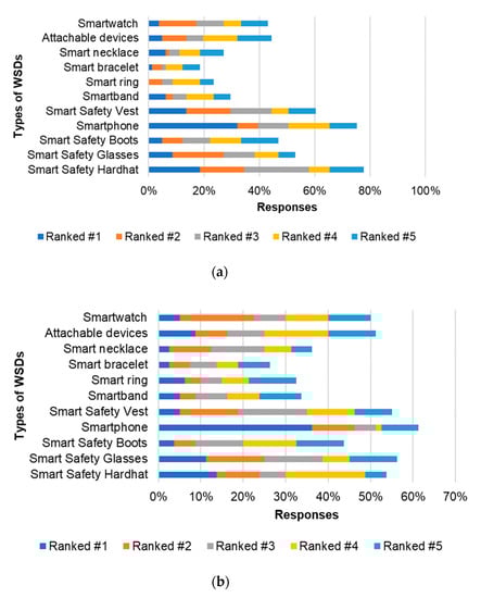 As discussed in Section 2, and illustrated in Table 3, several types of WSDs are currently commercially available. However, workers are likely to have preferences because some of the designs and mounting positions of the WSDs on the body may raise concerns for workers. It is important to provide organizations with insight regarding the preferred types of WSDs to ensure that appropriate purchase decisions are made. Given the envisaged and projected increase in the manufacturing and supply of WSDs, identifying the preferred type of WSDs could inform the design of future WSDs, since manufacturers could use this insight to shape and inform the final design of their products. Therefore, participants were also asked to indicate their preferred types of WSDs. Figure 3a,b depicts the responses received from FWs and MP, respectively. Figure 3a,b, consistent with Table 2, ranks smartphone-based wearables as the widely used and most preferred WSDs (ranked as the most preferred by 32% and 35% of FWs and MP, respectively). This indicates that management and FWs are more comfortable with smartphone-based wearables. The preference for smartphones could be due to the reported resistance workers have against putting on additional PPEs or carrying additional devices [,]. The second and third most preferred WSDs (in terms of WSDs ranked #1) for FWs was the smart hard hat and smart vest. Smart hard hats and smart glasses received the second and third most first-place preferences by management.