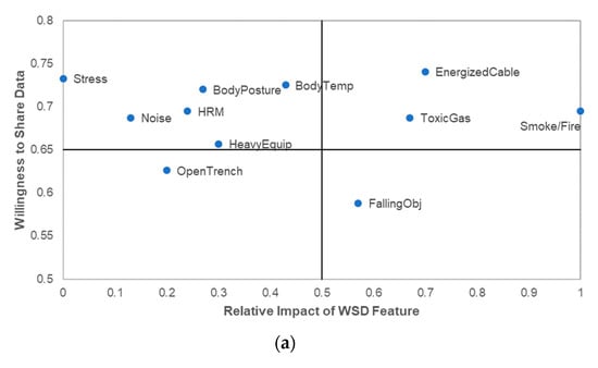 A primary factor that influences the adoption and successful integration of a technology is ensuring that the technology meets a critical need of end-users. The results from assessing FWs and MP responses indicate that all functions are impactful. Therefore, organizations integrating WSDs with the sole purpose of improving workers’ safety and health, with limited emphasis on data collection through WSD, should prioritize WSDs functions that meet their needs. For instance, a construction company in a region with extended periods of high temperature and humidity along with a high electrocution incident rate could opt to implement a WSD that captures body temperature and detects energized materials. Workers will be open to using WSDs with these functions. However, workers may be less likely to share data captured through physiological function (body temperature, in this case). It is important to note that this finding may differ if assessed with a pool of workers with no experience using WSDs. For instance, while workers with experience using WSDs find value in the physiological functions, workers with limited experience using WSDs will be less likely to find value in physiological functions due to their resistance to sharing their physiological data [].