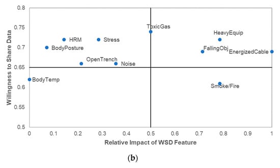 - Quadrant II (top left): Given the critical role data sharing plays in WSD acceptance, and in line with the popular IP Matrix [], the top left quadrant was identified as the second most important quadrant. Moreover, each function was rated above 5.0 with regards to the function’s impact on workers’ safety and health, which suggests that all functions are useful. Therefore, the matrix analysis is skewed towards prioritizing data sharing. Functions in this quadrant are important and should be given serious consideration. This quadrant is the “important/good to have/secondary” quadrant;