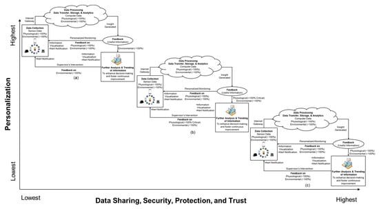 The framework typifies the transitionary phases of a personalized WSD system—starting with the three critical functions and expanding to all 11 functions. The first phase of the framework (Figure 4a) shows the proposed system, which is based on FWs receiving environmental and physiological notifications, while the safety professional receives only a select number of environmental metrics. For instance, if a worker is close to an energized cable, the wearable device transmits all information (both physiological and environmental metrics) to the fieldworker, while only the non-personal information (i.e., environmental metrics) will be transmitted to the safety supervisor. Figure 4b depicts a personalized system where the FW could control the type of information that is transmitted to the safety personnel. In the Figure, for instance, a worker could receive a warning from all 11 WSD functions. However, the safety personnel can only receive notification from the environmental functions (e.g., detection of energized cable/equipment, toxic gases, and smoke/fire) and specific physiological functions that the worker is willing to share. Importantly, there will be no penalty for refusing to share information from the other functions. Figure 5c depicts the third phase of integration, where workers and safety professionals could have access to data from all WSD functions. Workers receive alerts from all the functions and the same alert is transmitted, in real-time, to the safety professionals managing the specific project the worker is involved in. Sharing a wide range of information will provide safety personnel with the opportunity to provide personalized responses and feedback to workers.