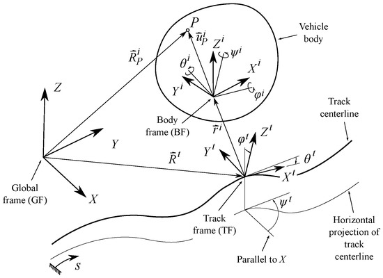 where is the arc-length along the track of the position of the body, and are the non-zero components of the position vector of the BF with respect to the TF, this is , and are three Euler angles (roll, pitch and yaw, respectively) that define the orientation of the BF with respect to the TF. Note that, out of the six coordinates used for the kinematic description of a body, only the arc-length coordinate is an absolute coordinate, being the other 5 track-relative coordinates.