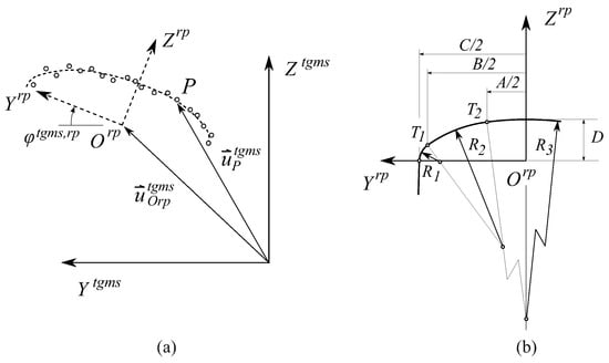Figure 6a shows a sketch of the cloud of points and, in dashed line, the theoretical rail-head profile. The theoretical rail-head profiles, when they are new, not worn, have a known geometry that is made of circular and straight segments. An example is the UIC 54 E1 rail-head profile shown in Figure 6b. Detecting the rail cross-section from a camera frame can be solved with the well-developed computer vision algorithms of feature detection or feature tracking [20]. However, in this investigation, because the feature to be detected can be represented analytically, an optimization approach has been developed. The optimization problem consists of finding the position and angle of the rail profile that better fits the cloud of points. This will be the assumed position and orientation of the rail head profile ( or ) in the TGMS frame when the vehicle is moving. The objective function to minimize is the sum of the squares of the distance of the points in the cloud to the theoretical profile curve shown in Figure 6b.