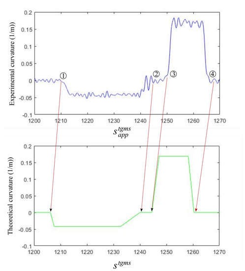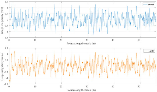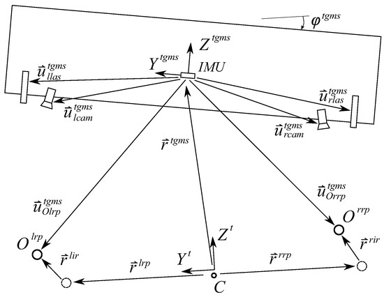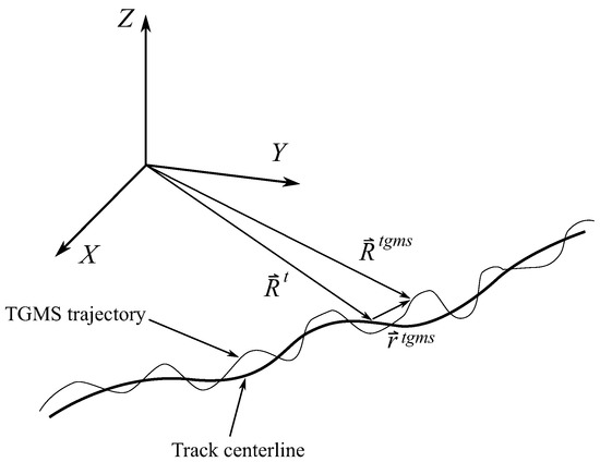 - The calculation of the absolute track irregularities ( and ), as shown in Equation (27), needs, in addition, the relative trajectory of the TGMS with respect to the TF.