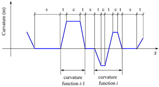 where contains the components of vector shown in Figure 2. The geometry of the track centerline 3D-curve is defined by the horizontal profile and the vertical profile. Both profiles are defined in the rail industry using sections of variable length. Points between two sections are called vertices. Horizontal profile vertices do not necessary coincide with vertical profile vertices. Horizontal profile includes three types of sections: tangent (straight), curve (circular) and transitions (clothoid). Vertical profile includes two types of sections: constant-slope (straight) and transitions (cubic).