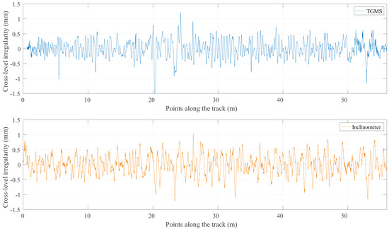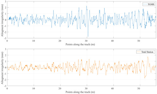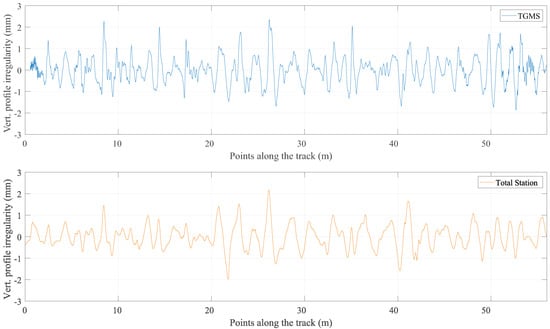 The absolute irregularities are compared in Figure 18 and Figure 19. As it can be observed, the agreement is fine, but not as good as the agreement of the relative track irregularities. The reason is clearly the influence in the results of the approximations and noise associated with the calculation of the TGMS to TF relative trajectory explained in Section 9. Recall that this relative trajectory is not needed for the calculation of the relative irregularities. It can also be observed that the measurements of the designed TGMS shows higher spatial-frequencies than the measurement with the total station. However, these higher frequencies must not be considered as noise, because the measuring method used with the total station can not detect high-frequency (short wavelength) irregularities.
