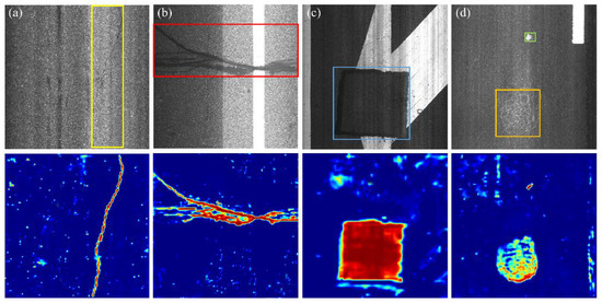 Five common types of damage. (a) Curvilinear damage. (b) Bar-like damage. (c) Block-like damage. (d)Grid-like and small damages. Damage is extremely susceptible to disturbance by complex backgrounds and unsatisfactory imaging conditions. Second row shows visualizations of the highest resolution feature map by the proposed backbone network.