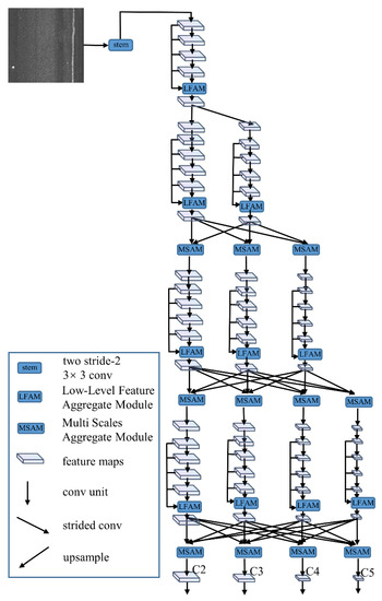 As shown in Figure 2, the proposed framework is based on Cascade RCNN [18], which primarily includes the LrNet backbone network, length-aware head, and cascade detection head. LrNet reuses low-level features, dynamically fuses discriminative receptive field features, and outputs four resolutions feature maps, as shown in Figure 3. CrdNet mixes the four resolution representations of LrNet to avoid loss of information, and outputs one enhanced high-resolution multi-scale feature fusion. A set of 3 × 3 convolutions with increasing dilation rates acts on the enhanced features to construct three kinds of parallel high-resolution length-sensitive feature branches for small, medium, and long damage detection. Proposals are generated by a region proposal network (RPN) [15] in CrdNet with MSARM. CrdNet uses an adaptive ROI assignment function to determine which branch is assigned by length. In the cascade detection head, ROI Align [20] is used to extract features for ROIs and perform three-stage cascade proposal classification and bounding box regression. The rest of this section discusses the process in more detail.