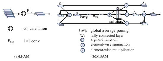 where Fblend is the fusion feature of a sub-stream, and and θc represent the 1 × 1 convolution and its parameters, respectively. The directly connected and aggregated strategy of LFAM avoids the difficulty in backpropagation of gradients in sub-streams. The module can effectively extract and retain low-level features in the sub-streams to achieve diversified feature representation.