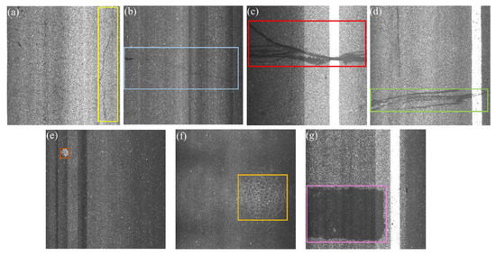 HL2019 dataset. (a) Longitudinal crack (LC). (b) Transverse crack (TC). (c) Repair (P). (d) Poor repair (PR). (e) Pothole (P). (f) Crazing (C). (g) Block repair (BR).