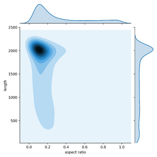Aspect ratio and length distribution of damage in the dataset. Center of the image is joint distribution of aspect ratio and length. Top and rightmost parts are aspect ratio and length distribution, respectively.