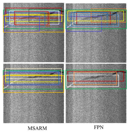 The anchor-based two-stage detector is a kind of heuristic algorithm. If the scale and aspect ratio of the RPN do not fit the distribution of the training data, it leads to poor performance. Figure 8 illustrates the anchors generated by RPN under the two anchor mechanisms. When IOU is 0.7, the positive samples generated by the two anchor mechanisms have a significant drop. To increase the recall of the models, we chose 0.5 as the IOU threshold for RPN during training and testing. The proposed MSARM generated more and higher-quality positive sample anchors than FPN under different IOUs. This means that the anchors generated by MSARM effectively cover damage with abnormal geometric properties, which avoids the CrdNet only learn the background area of images and improves the damage detection results.