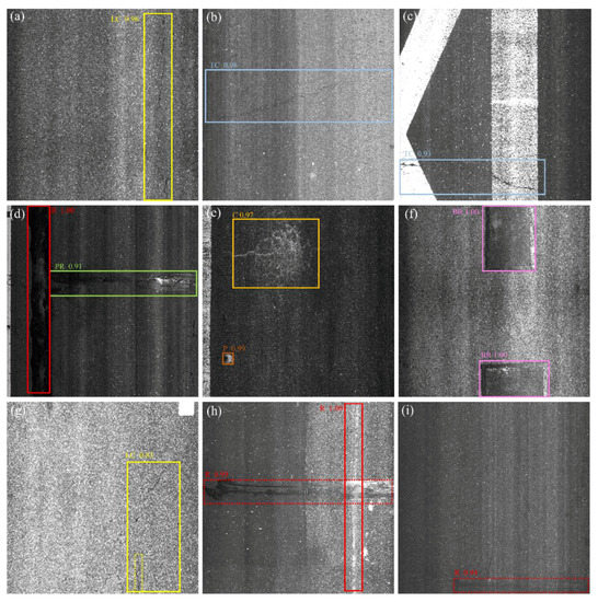 The third row of Figure 9 shows several detection failures of CrdNet. First, the dashed yellow bounding box in Figure 9g represents false negative crack detection, largely because the backbone network is unable to effectively extract discriminative features of this subtle damage, or the concerned training images within the training set are scarce. Second, CrdNet misreports poor repair as repair, as shown in Figure 9h. After analyzing this false positive, it was found that this was due to duplicate annotations on the same image. The supervisors labeled this type of damage as both repair and poor repair. Our model confused the detection of this kind of damage that is difficult for humans to define. Finally, Figure 9i shows that we have a wrong prediction of block repair. Block repair generally has the traits of relatively regular shape, simple internal topological structure, a large gap with the background and several corners, and the corners are the key features in this damage. The main reason for the false positive in Figure 9i is that the backbone network failed to actively pay more attention to the key features of the damage in the process of extracting features. In future work, it will be necessary to explicitly add prior knowledge of the damage in the feature extraction process to address this failure prediction.