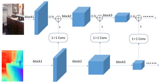 After each block of RGB encoder and depth encoder, the depth feature is fed into 1 × 1 convolution, and then we add the RGB and depth features together via a proportion parameter .