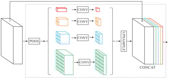 In order to capture the different scales of global contextual information, we adopt the module proposed by [81], Pyramid Pooling Module (PPM), which is shown in Figure 4. In the segmentation of complex scenes, it is very important to obtain global contextual information from the input image. In the deep convolutional neural network, the size of the receptive field can roughly measure the amount of contextual information captured. In addition, the receptive field of the network calculated theoretically is potentially larger than the size of the input image. However, in fact, the empirical receptive field of the network can be smaller, especially in the high-level layers of the network [81]. The global average pooling can solve this problem well. We use four different scales of global average pooling layer () to process input features. After dimension reduction by convolution layer, the low-resolution feature maps are restored to the input feature size by bilinear interpolation upsampling. Finally, we concatenate the features of different levels to obtain the final pyramid pooling global feature.