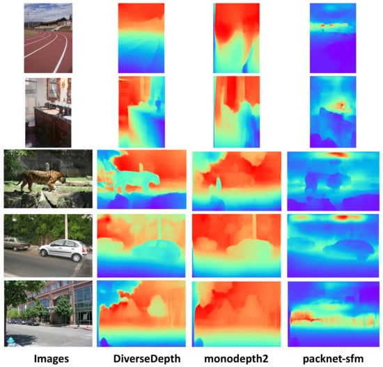 The comparison results of different depth estimation methods on the ADE20k dataset. Because of the lack of the ground truth, we do not retrain depth estimation models. The depth estimation results come from the application of the original models from [21,74,84], respectively. All of the images are not included in the training sets of these three models. The scene in the images includes indoor, outdoor, streetscape, and natural environment. Blue parts mean being closer to the camera, while red regions are farther.