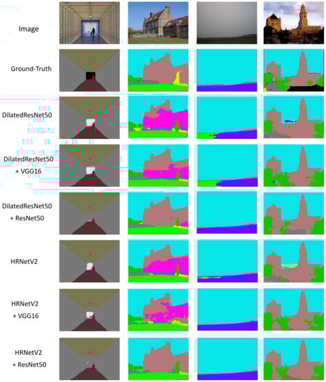 From Table 1, we can see that, after the depth encoders are added, the models show certain improvement on the ADE20K validation set. Resnet50 has a better performance than VGG16 as a depth encoder. For mean IoU, Resnet50 has improved by 0.7–1.2% compared with the original network (without depth encoder). VGG16 also has improved by 0.4–0.6%. Among them, the depth encoder improved DilatedResNet50 most, VGG16 and Resnet50 improved 0.6% and 1.2%, respectively as the depth encoder. In addition, the HRNetv2+Resnet50 model achieves the best performance which gets an 82.01% pixel accuracy and 43.98% mean IoU separately. The result indicates that the depth feature can provide a certain amount of information for segmentation, which is consistent with our thinking.