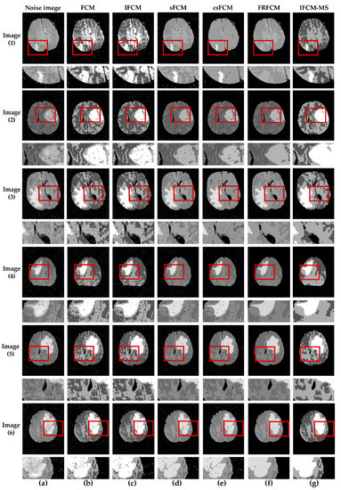 To verify the segmentation performance of the IFCM-MS further, we added 2% of salt-and-pepper to the images. Moreover, the proposed algorithm is compared with the other algorithms described above. Figure 3 shows the segmentation results of the tumor produced by the different algorithms mentioned above. In Figure 3, the results are marked by red squares; for facilitating observations, the marked area was enlarged and placed below the original image. It is clear that our algorithm shows excellent performance in tumor detection. As the images of Figure 3b,c indicate, the FCM and IFCM do not overcome its sensitivity to noise, which leads to poor segmentation results. More than that, the tumor is clustered into normal brain tissue. Though the csFCM combines the spatial neighborhood information, it is unable to segment the tumor efficiently. In addition, the results from the csFCM segment the normal brain tissue inaccurately (red squares of column (e)). Just like the red squares show, for Image (2), there are many misclassifications of the tumor area in Image (2b–f), whereas the IFCM-MS provides good segmentation results (Image (2g)). Compared with the FCM and IFCM, the results from the IFCM-MS and FRFCM eliminated the noise. However, it is obvious that the results from the IFCM-MS provide unambiguous internal organization and maximum robustness, which signifies the best effect for tumor segmentation.
