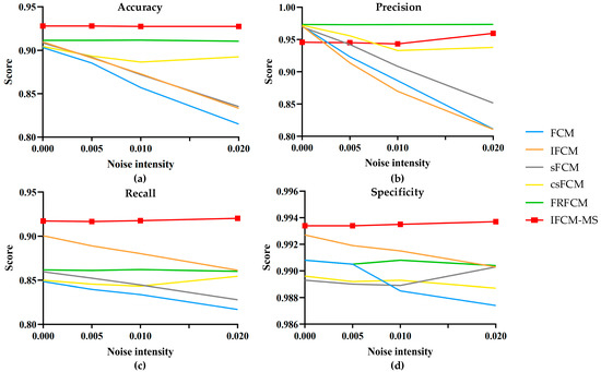 Figure 5a–d represents the fluctuation range of the evaluation indicators accuracy, precision, recall and specificity, respectively. The vertical axis represents the average evaluation value of all the experimental results, and the horizontal axis expresses the different noise intensities. As shown in Figure 5, compared with the FCM, IFCM, sFCM, csFCM and FRFCM, not only the accuracy, recall and specificity of IFCM-MS are closer to 1 but, also, the fold line fluctuation range is the lowest. Therefore, it is obvious that the IFCM-MS is much more robust and competent than the other algorithms.