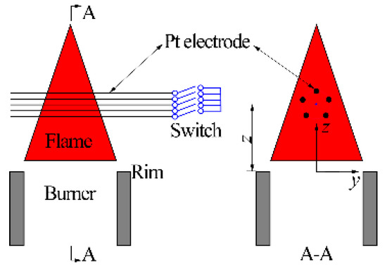 For minimizing the electrode interference with the flame, a single platinum wire was horizontally mounted, and the measurement area was limited in the right part of the flame. The electrode radial position was specified by , which is the electrode tip coordinate in the x direction. Experimental conditions for this trial are listed in Table 5.